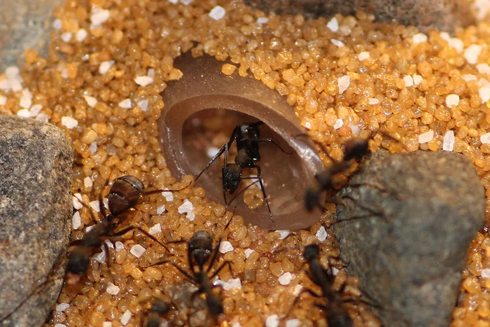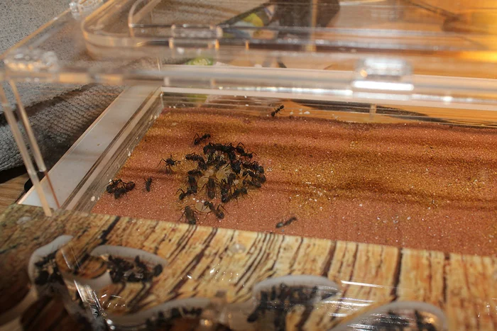 5 января 2026 года. Вечером начал выводить семью из зимовки. На арене скопилось приличное количество муравьев, не подающих признаков жизни. С чем связано такое число погибших непонятно. Возможно, в холодильнике в этот раз был более холодный режим. Возможно, слишком резкий уход на зимовку. В общем, этих бедолаг планировал убрать при полноценной чистке арены.