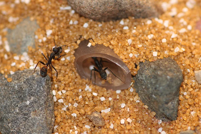 Утром 6 числа повторил процедуру, но ещё добавил к столу пару маленьких тараканчиков, чтобы начать разогревать интерес к белку – всё же в гнезде довольно большое число перезимовавшего расплода. Но пока так же особого энтузиазма не увидел. Матка жива и весьма энергична, к утру в целом муравьи уже распределились по всему гнезду, восстанавливая порядок в нем.