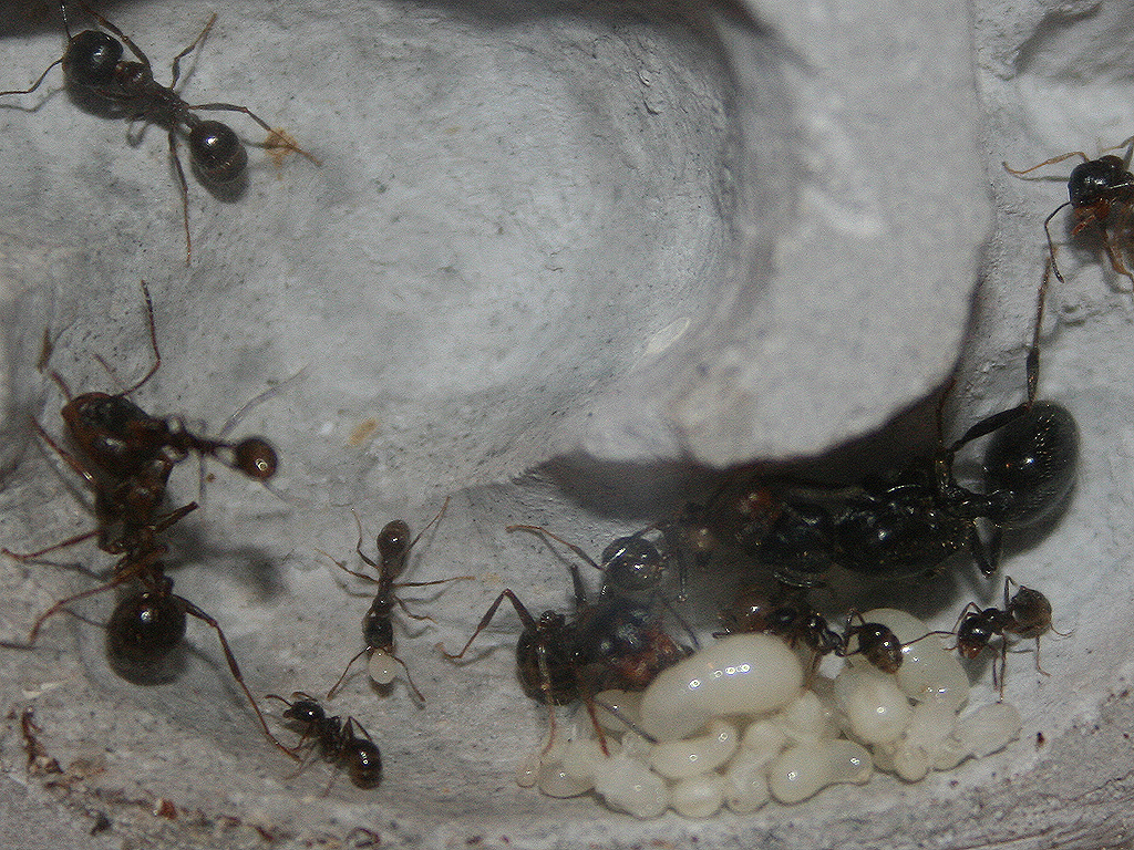 Lasius flavus - миролюбивый (а может просто беззащитный) вид. Этим пользуются другие виды муравьев - часто в гнездах